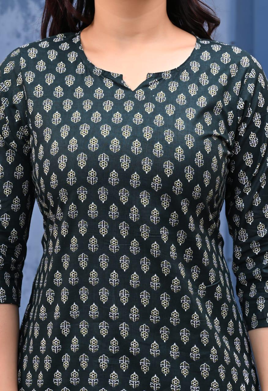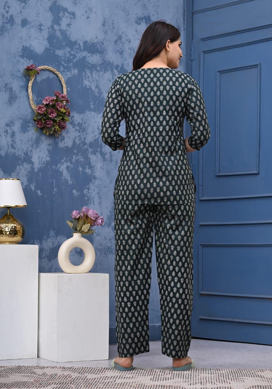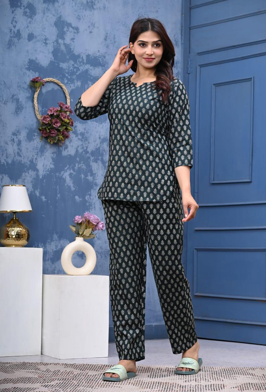This Pure cotton black jaipuri buti printed Loungewear/ Night suit set is a perfect blend of comfort and style. Crafted from soft cotton, it features a beautiful flower print. Enjoy stylish comfort all day with this set. With its attractive design and prints, it is suitable for loungewear, night wear, casual wear and more.