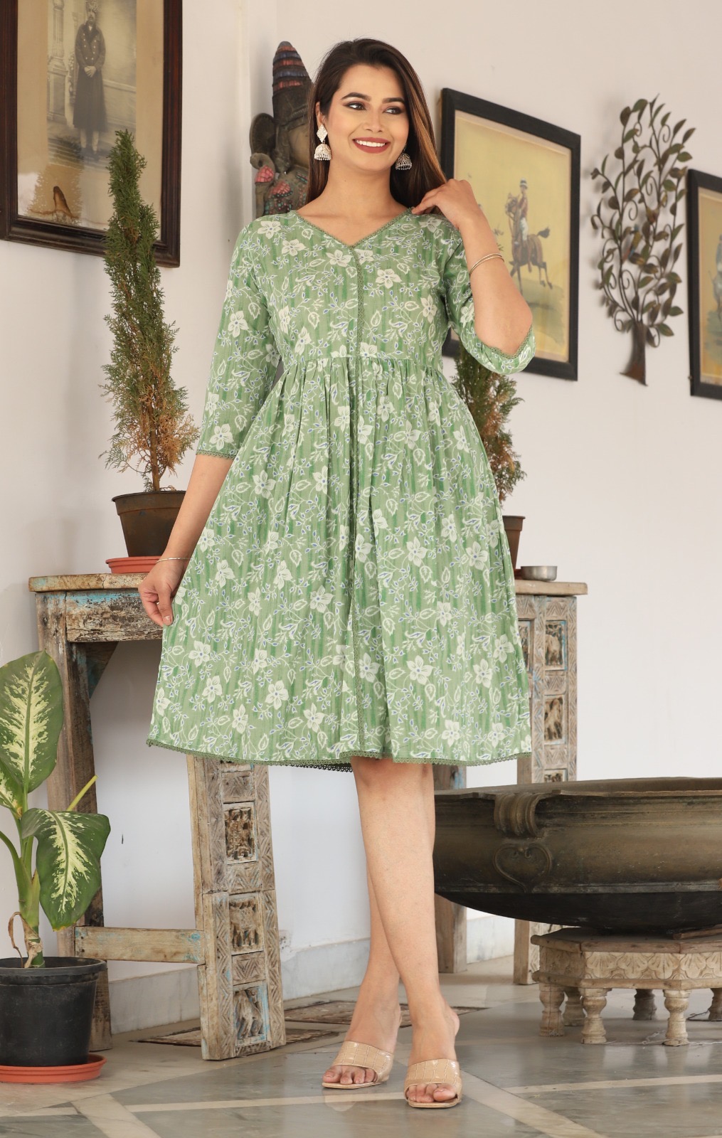 Slip into this beautiful Jaipuri printed cotton short dress. Made for any body type, this comfortable dress is the perfect choice for the summer season. Made with 100% cotton and comes with a crochet lace.