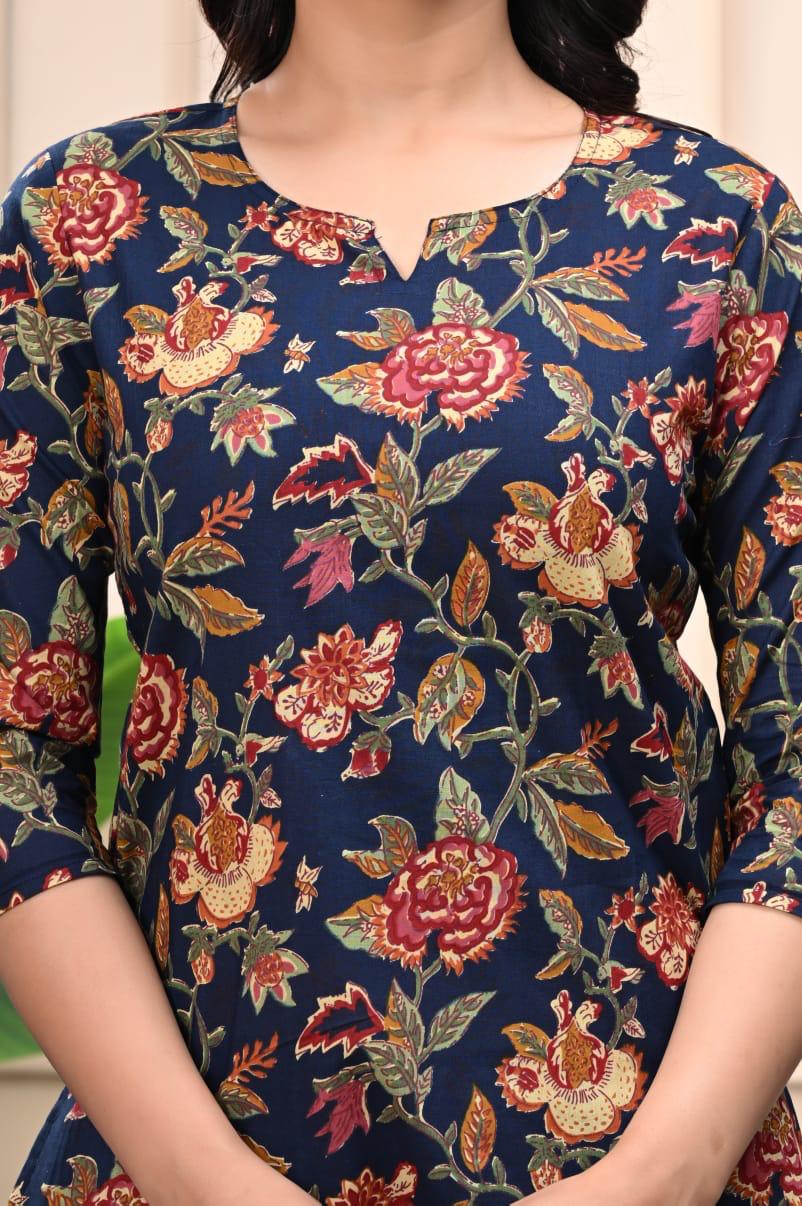This Pure cotton navy blue floral and buti printed Loungewear/ Night suit set is a perfect blend of comfort and style. Crafted from soft cotton, it features a beautiful flower print. Enjoy stylish comfort all day with this set. With its attractive design and prints, it is suitable for loungewear, night wear, casual wear and more.