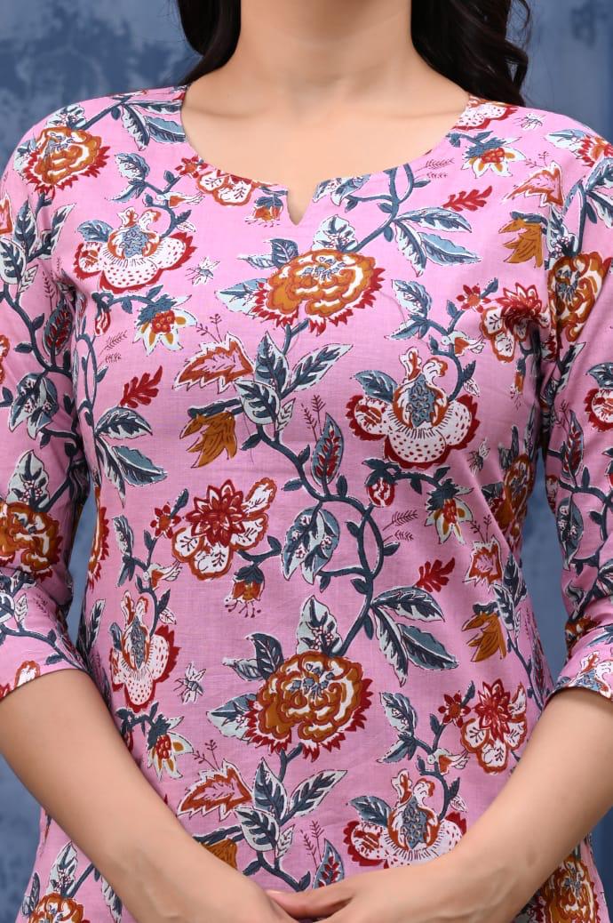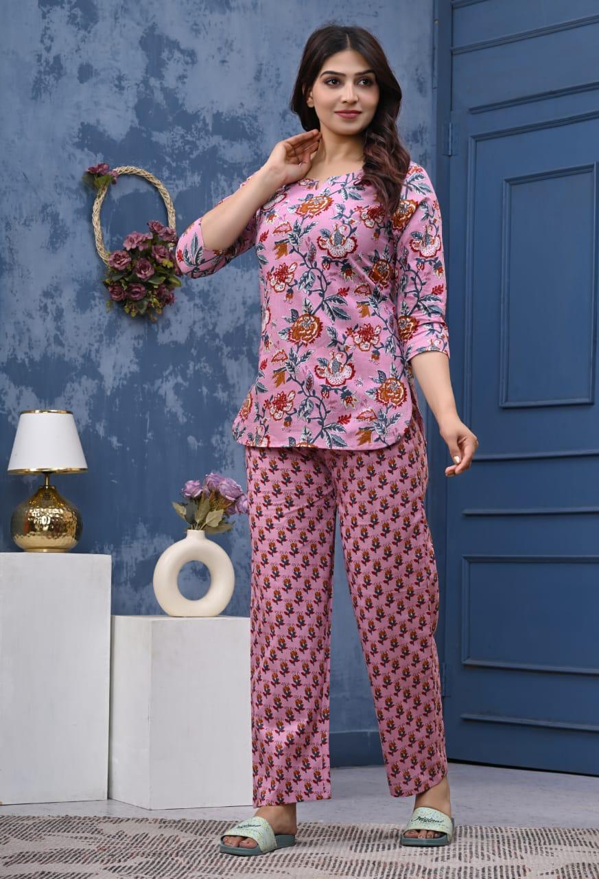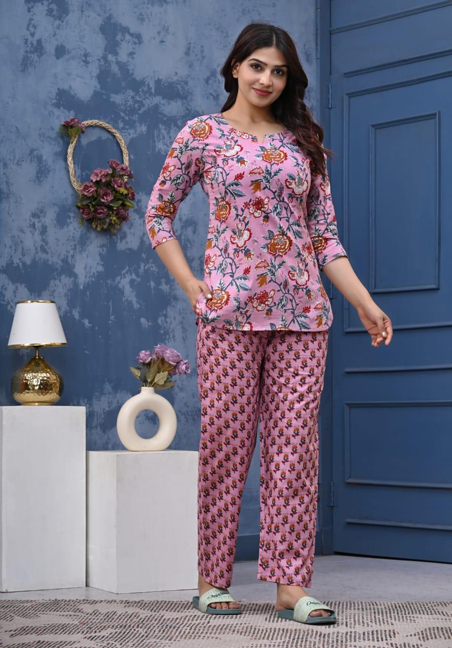 This Pure cotton pink floral and buti printed Loungewear/ Night suit set is a perfect blend of comfort and style. Crafted from soft cotton, it features a beautiful flower print. Enjoy stylish comfort all day with this set. With its attractive design and prints, it is suitable for loungewear, night wear, casual wear and more.