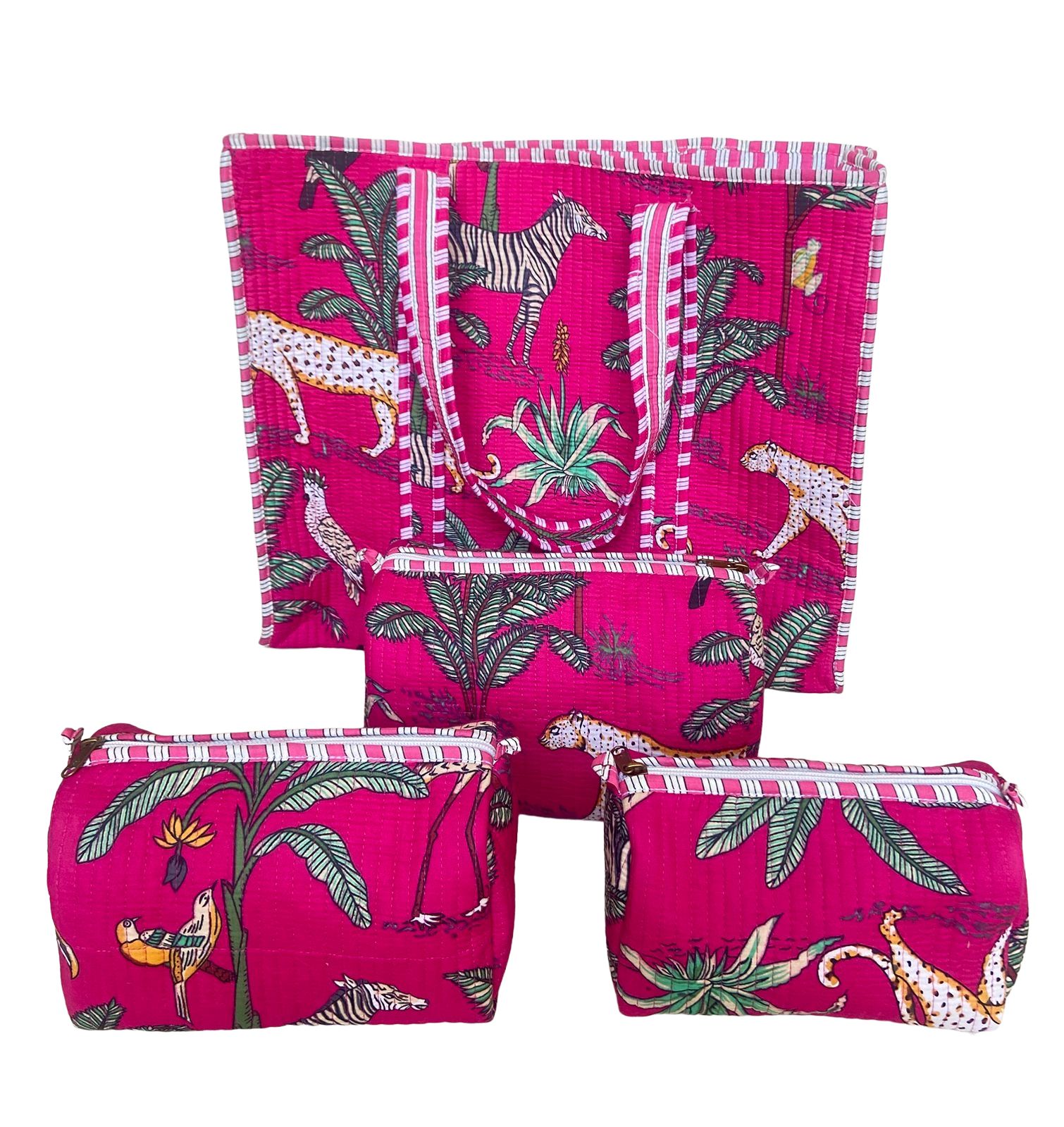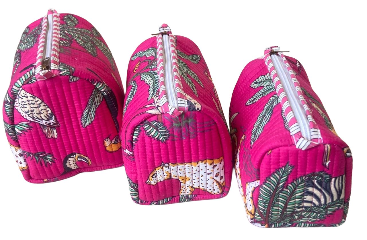 Introducing our pink jungle print quilted Tote bag with matching set of 3 multi utility pouches, a perfect blend of style and functionality. Hand printed fabric bag with 1 inside pocket and 3 pouches with heavy plastic lining . Crafted with eco-conscious consumers in mind, this bag features printed fabric, ensuring a cruelty-free and fashion-forward accessory. The premium quality accessories add a touch of sophistication, enhancing both the durability and aesthetic appeal. Designed to accommodate stuff this bag seamlessly transitions from office essentials to travel with ease. With a generous capacity, it can effortlessly hold up to 5 kg of belongings. A perfect product for gifting.