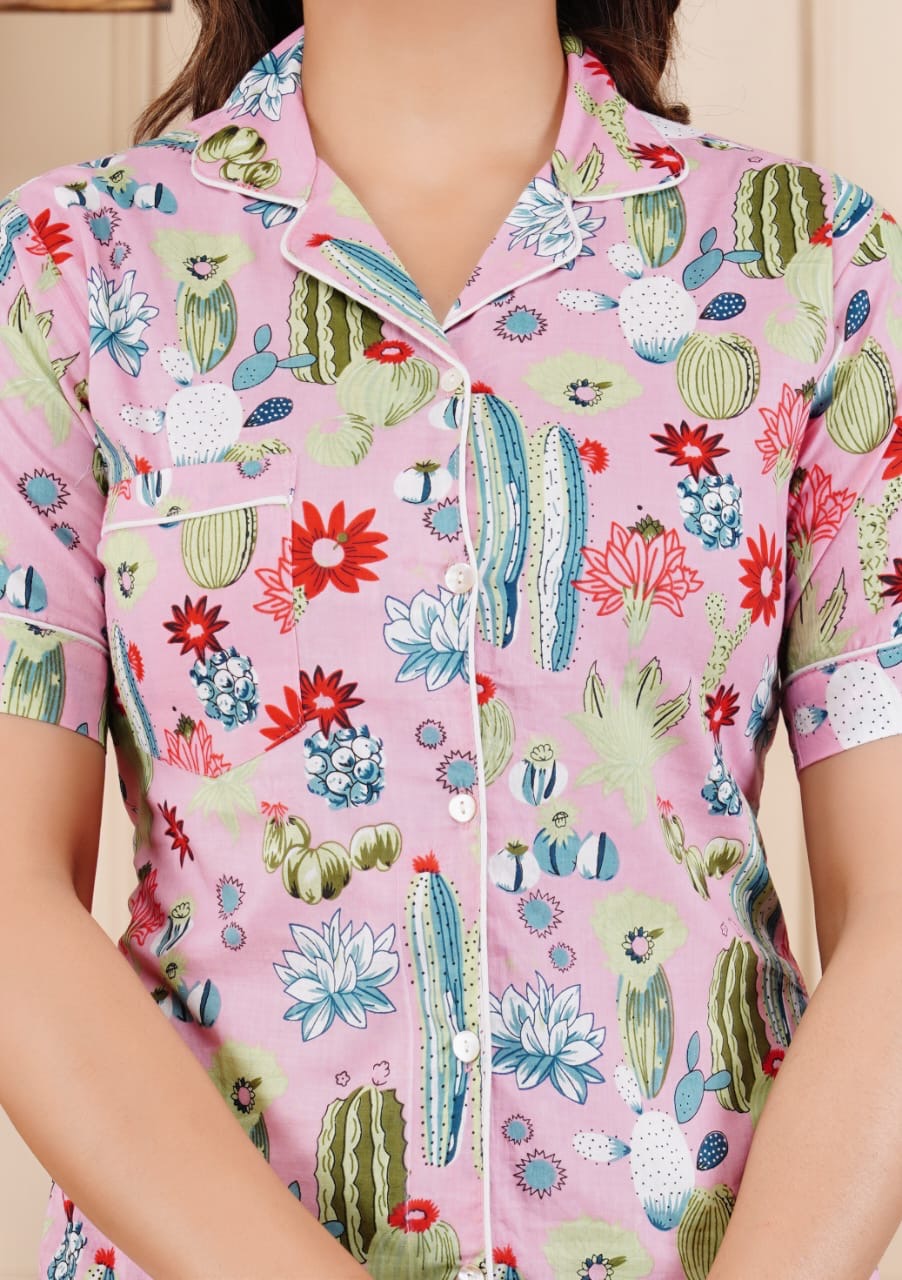 This 100% cotton comfy tropical pink night suit/ Co-ord set with pipen design is a perfect blend of comfort and style. Adorned with the floral print all over, this set comprises of a lounge half sleeves shirt and a matching shorts. Crafted from soft cotton, the set ensures the wearer enjoy stylish comfort all day/all night long with this set. Perfect for the summer season.