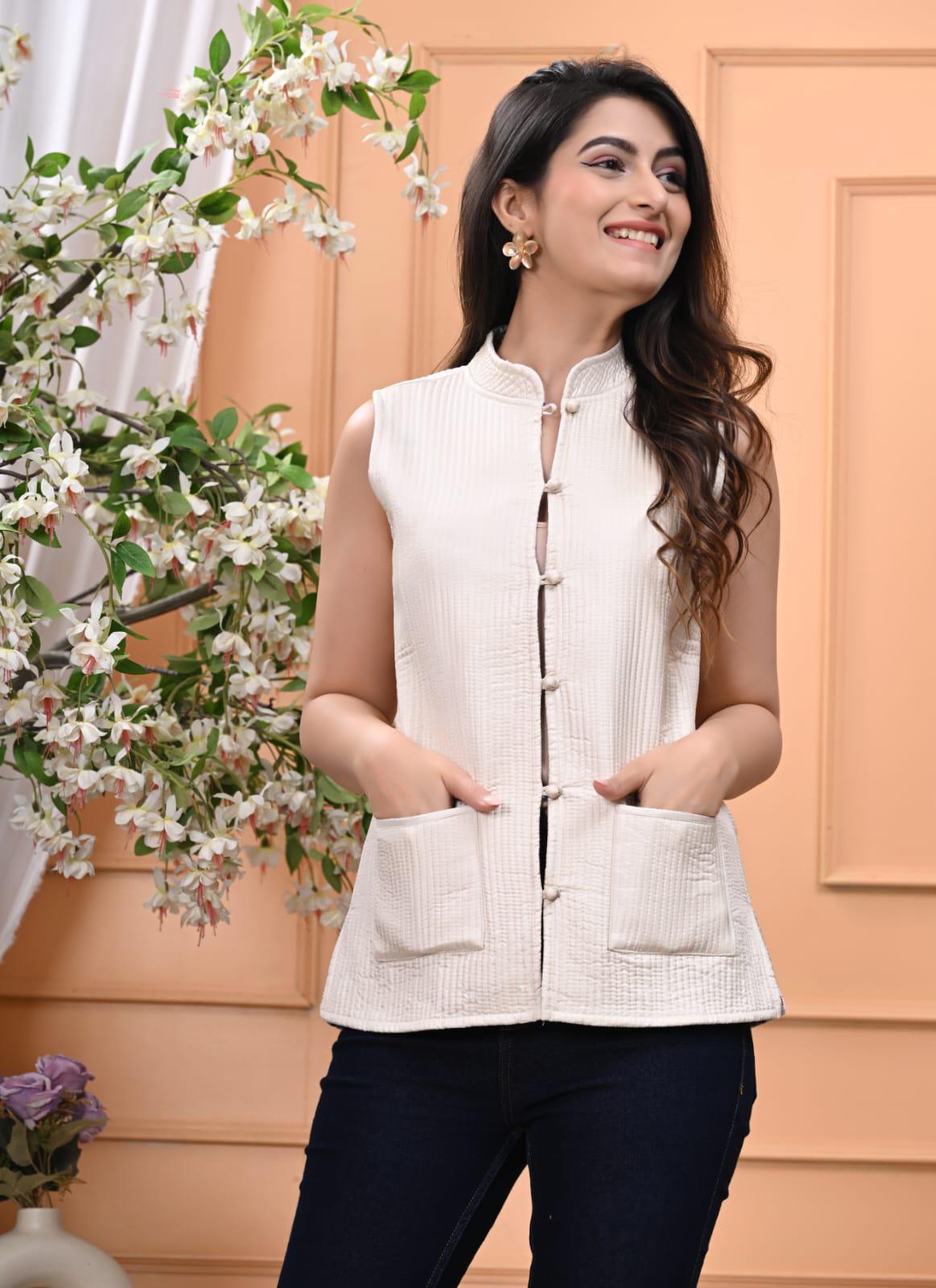 This 100% cotton silk quilted reversible jacket is a perfect choice for your winter outfits, pair it with Indian or Western wear for a formal daywear winter look. Crafted from soft cotton silk on one side and cotton fabric on the reverse, this white jacket features solid colour on one side and ikkat print on other. Ideal for casual wear, daily wear, office wear and Brunch.